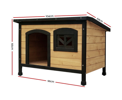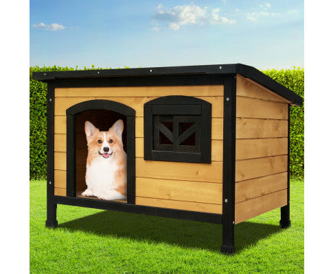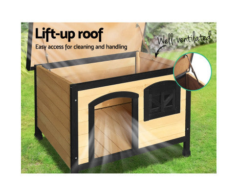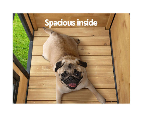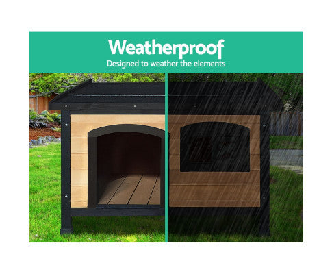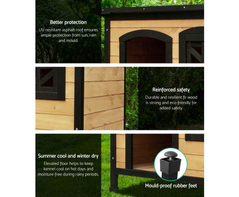 This quality Fir wood-built dog kennel fits larger-size dogs and is weatherproof and UV stabilized. Vents at the front and rear help to ensure that your pet is kept well-ventilated with fresh supplies of clean air.